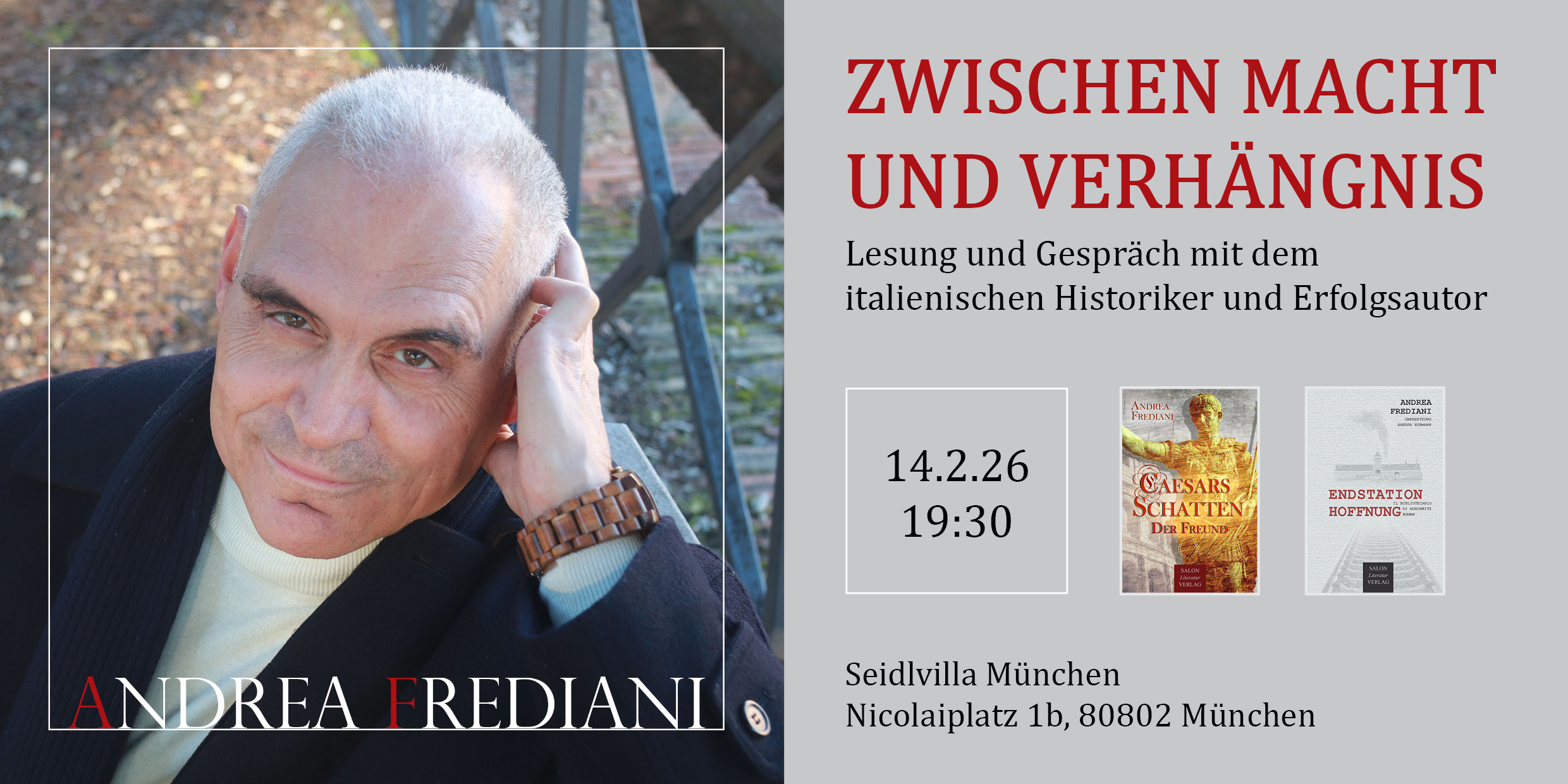 Wir freuen uns sehr, dass Andrea Frediani am 14. Februar 2026 erstmals sein Werk dem Münchner Publikum vorstellt. Frediani veröffentlichte mittlerweile über 60 Bücher (Romane und Sachbücher) mit einer Gesamtauflage von 1,6 Millionen verkauften Exemplaren. Der studierte Historiker gehört somit zu den erfolgreichsten Autoren Italiens.
